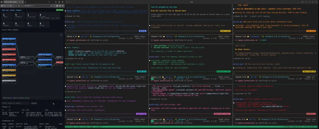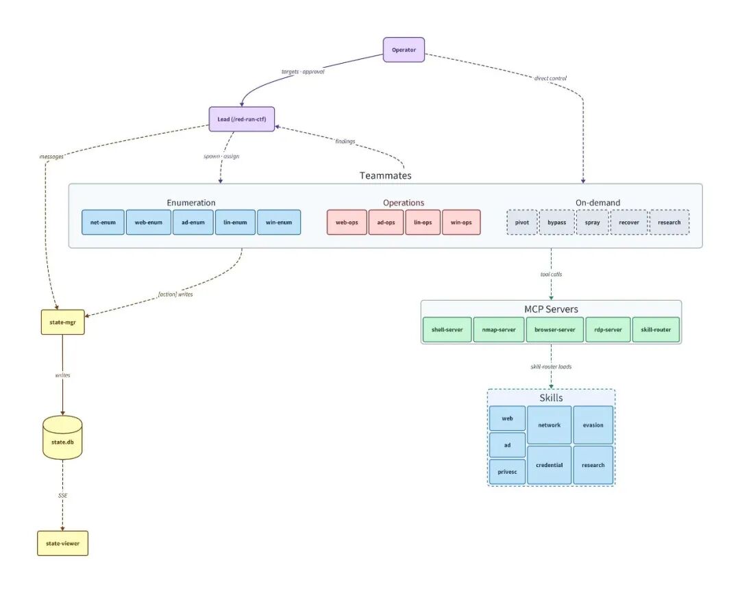 即便 agent teams 带来了更高的可见性,在代理推进任务的过程中有时仍然难以跟上节奏。新增的 state-mgr队友试图改善这一点——它充当副指挥,专职管理任务状态:跟踪发现及其状态、追溯来源、去重数据,并随着任务推进实时更新 state-viewer中的攻击链图。red-run-ctf的团队领导因此得以从记录员的角色中解放出来,把更多精力放在及时将可操作的发现分派给对应技能的队友上。