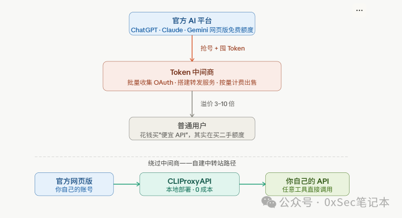 事情要从 AI 平台的定价策略说起。 OpenAI、Anthropic、Google 这些公司,一方面提供付费 API(按 Token 计费,价格不低),另一方面又有网页版——ChatGPT Free、Claude.ai 免费套餐、Gemini 基础版——这些网页版对普通用户是免费的,每天有一定额度,用完了等明天。 网页版是为人设计的,但它背后走的一样是真实的模型。 然后有一批人发现了一件事:网页版登录之后会生成 OAuth Token,这个 Token 理论上可以模拟 API 调用。只要把这个 Token 截下来,做一层转发,就能把"网页版免费额度"包装成"API 服务"对外出售。 于是整条产业链就跑起来了: 批量注册账号(或者收购别人的账号),囤积 OAuth Token,搭一个转发服务,设置一个比官方 API 便宜一截的价格,卖给需要便宜 API 的开发者和个人用户。 中间商赚的是什么?就是"信息差"加"技术门槛"——明明是免费额度,但大多数人不知道能这么用,也不知道怎么自己搭。 溢价有多高?随便看几家,3 到 10 倍都算正常。