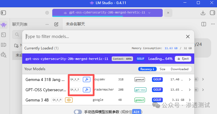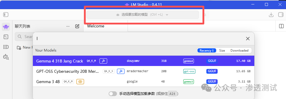 输入模型名称(如SecGPT, Cybersecurity, Gemma-4-31B、Gemma-4-26B-A4B-JANG_2L-CRACK),建议加 gguf 筛选格式。也可使用文章末尾推荐的【 🛡️ 网络安全相关大模型】搜索模型名称即可下载。
