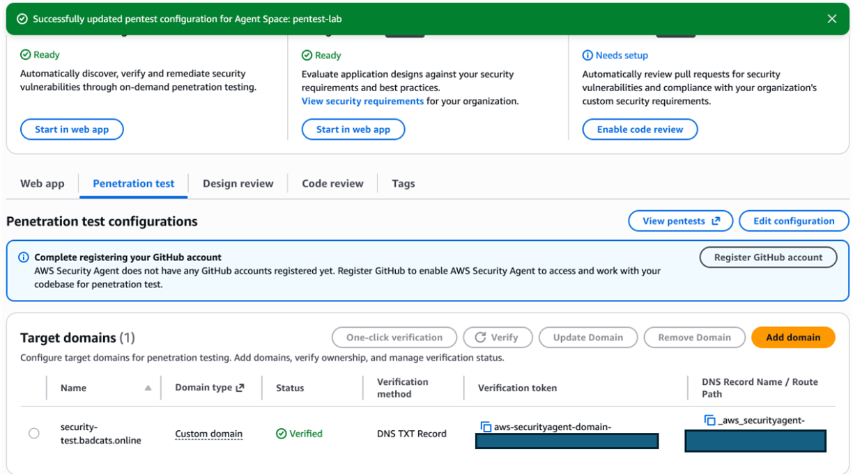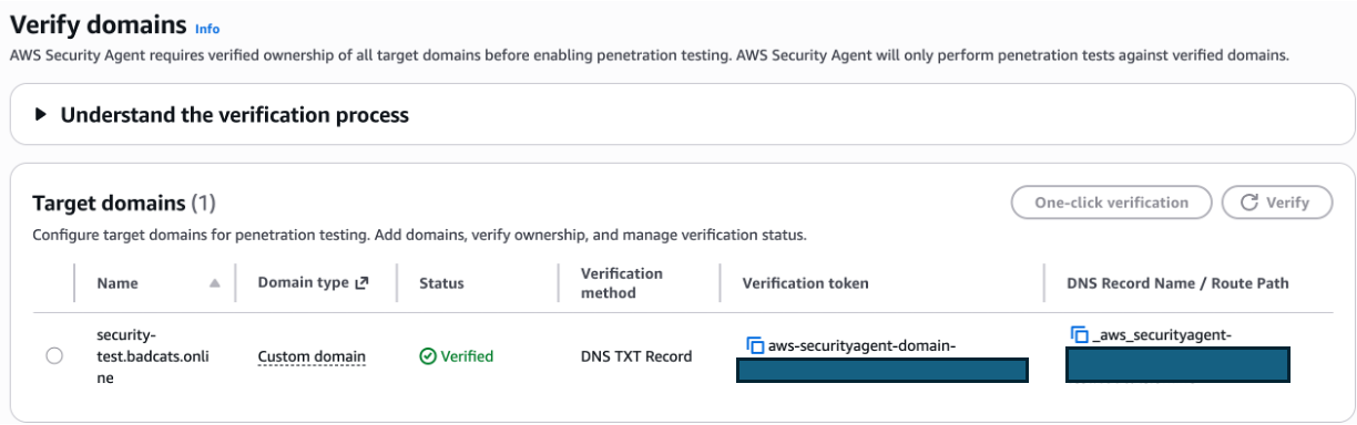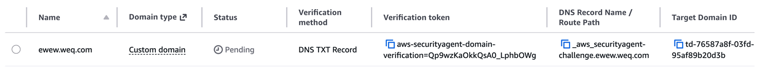 DNS 记录名由 AWS Security Agent 自动生成,格式可能和你预期的不同。务必从 Console 复制,不要手动拼写。