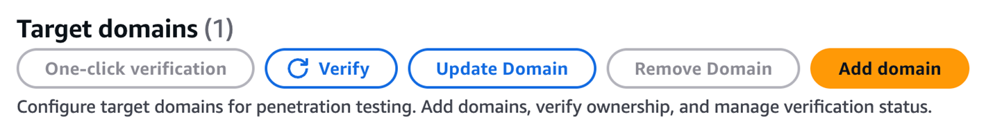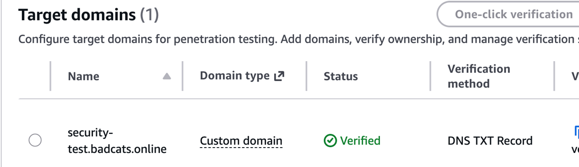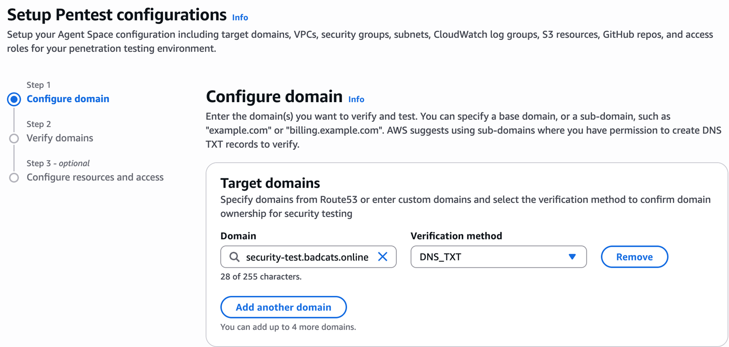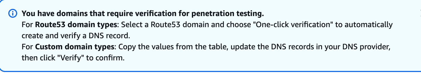 域名类型 说明 验证方式 Amazon Route 53 域名(同账号) 域名在同一 AWS 账号的 Route 53 中管理 一键验证(自动创建 DNS 记录) Custom domain 域名在其他 DNS 提供商管理 DNS TXT 记录 或 HTTP Route 验证 VPC 私有域名 应用部署在 VPC 私有子网中,无公网访问 通过 VPC 配置接入,验证可在渗透测试启动时自动完成
