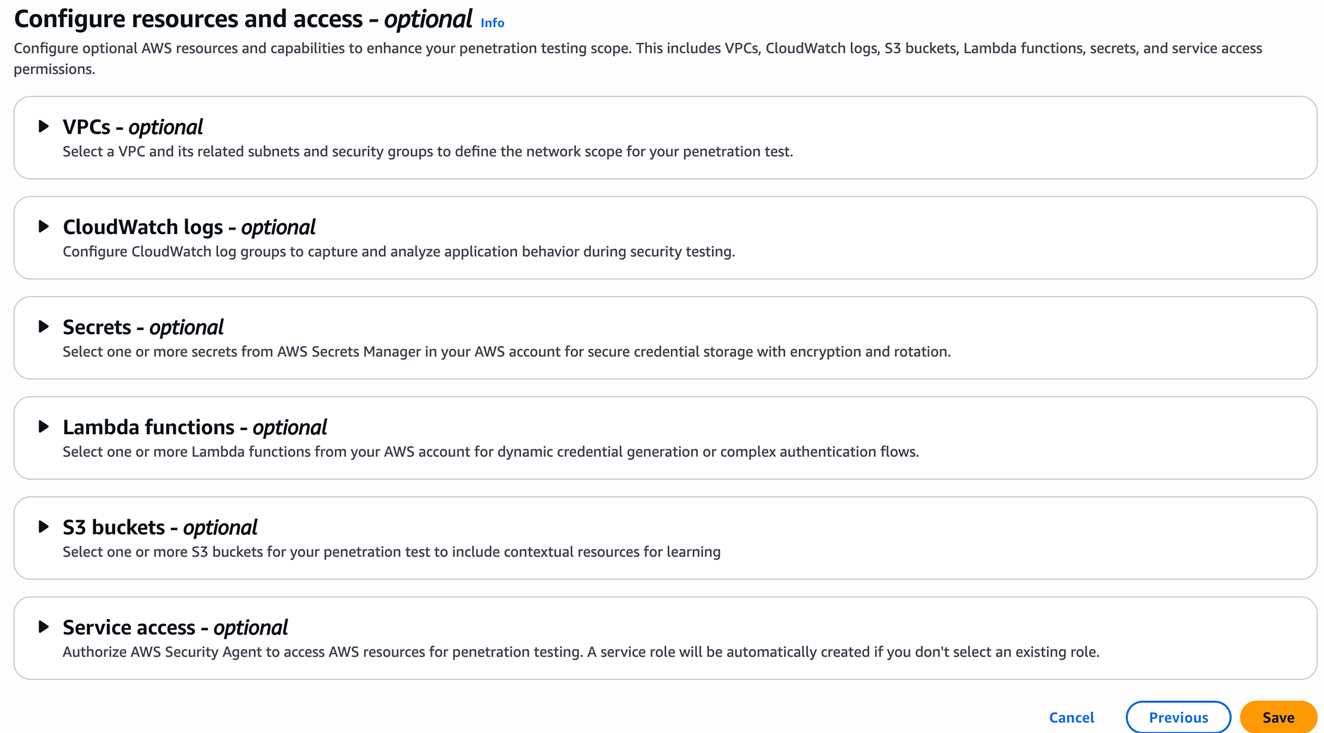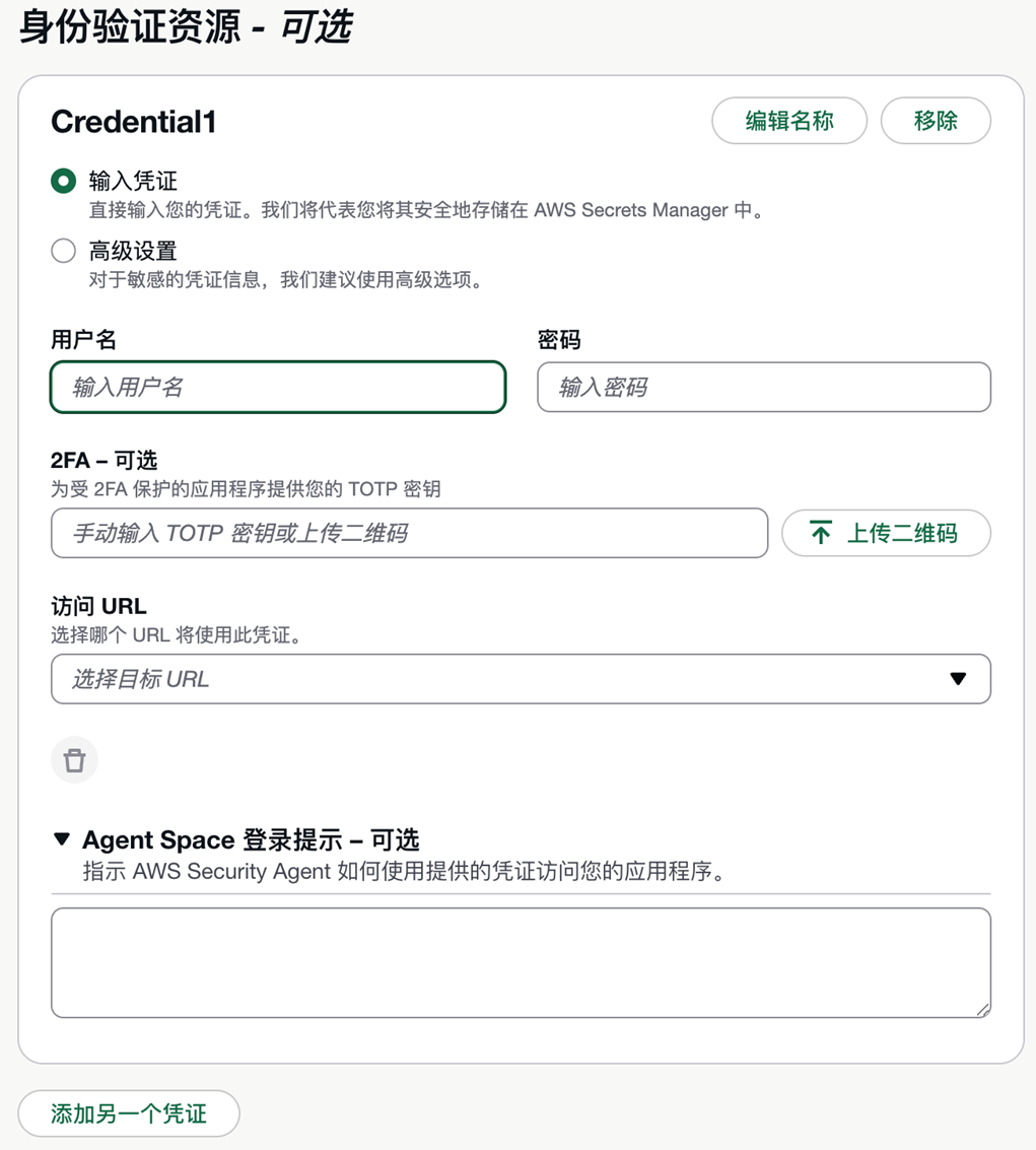 如果目标应用部署在 VPC 私有子网中且没有公网访问入口,需要在这里配置 VPC、子网和安全组,让 AWS Security Agent 通过 ENI(弹性网络接口)接入你的 VPC。
