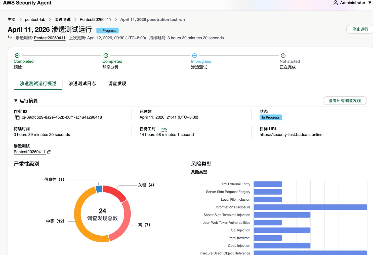 典型运行时间:包含所有风险类型时约 12 小时。可以随时点击右上角 停止运行 终止测试。