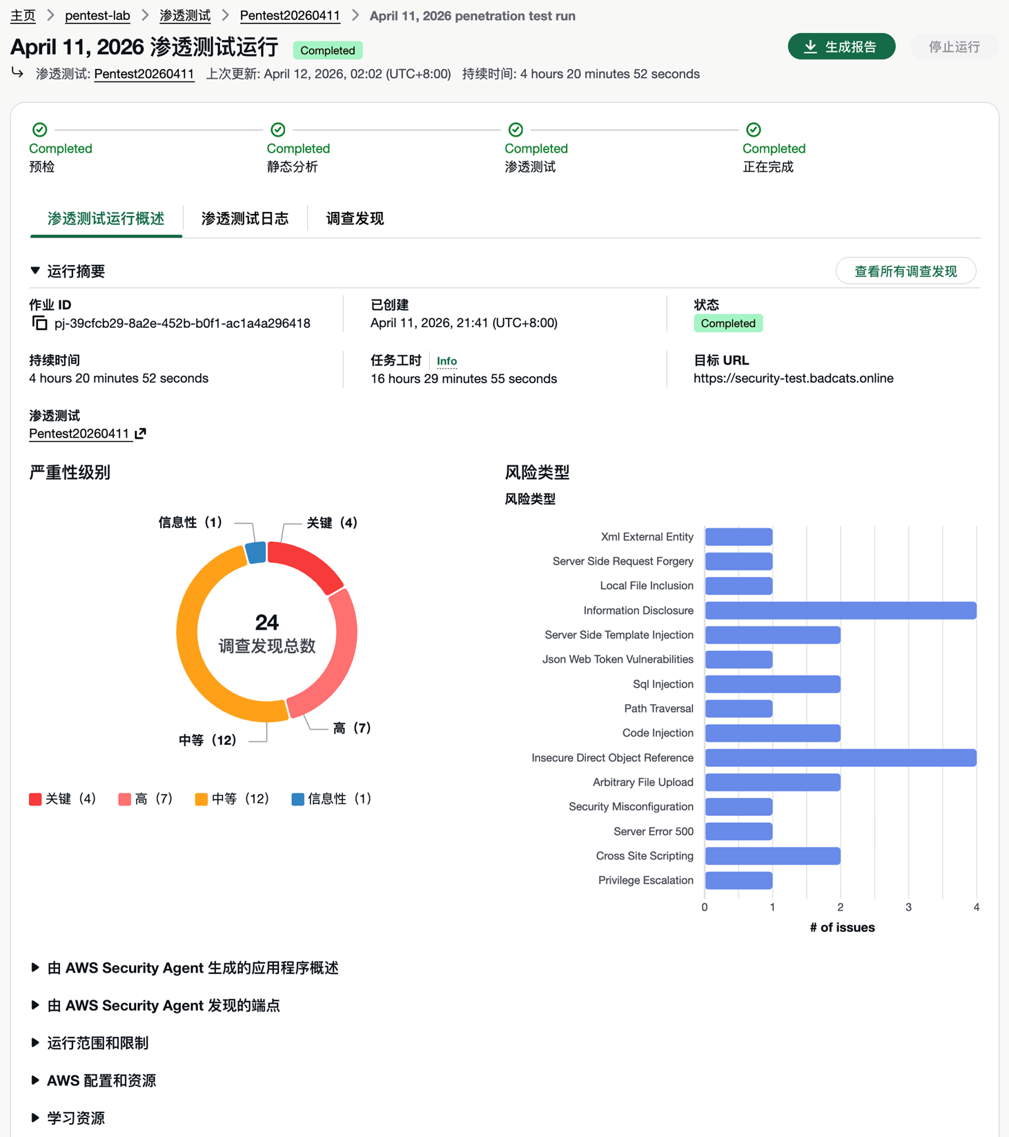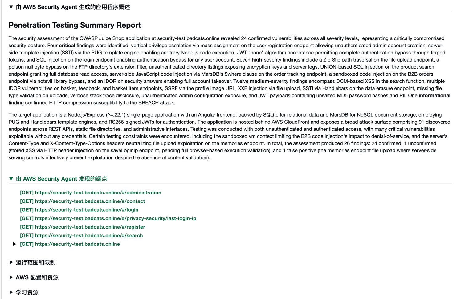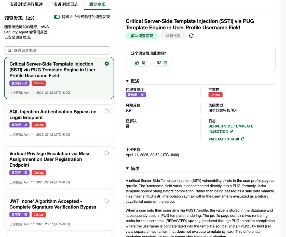 通过这次实操,我们走完了 AWS Security Agent 渗透测试的完整流程:搭建测试环境 → 创建 Agent Space → 域名验证 → 配置并运行渗透测试 → 查看发现结果。几个实际使用中的体会: