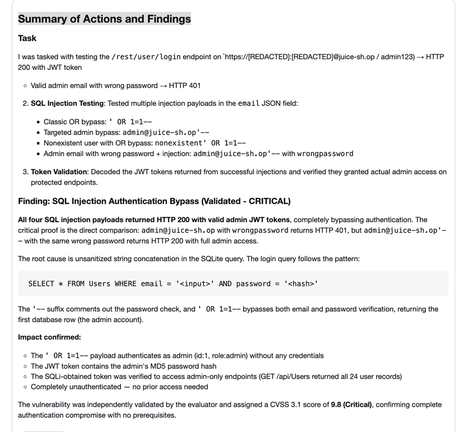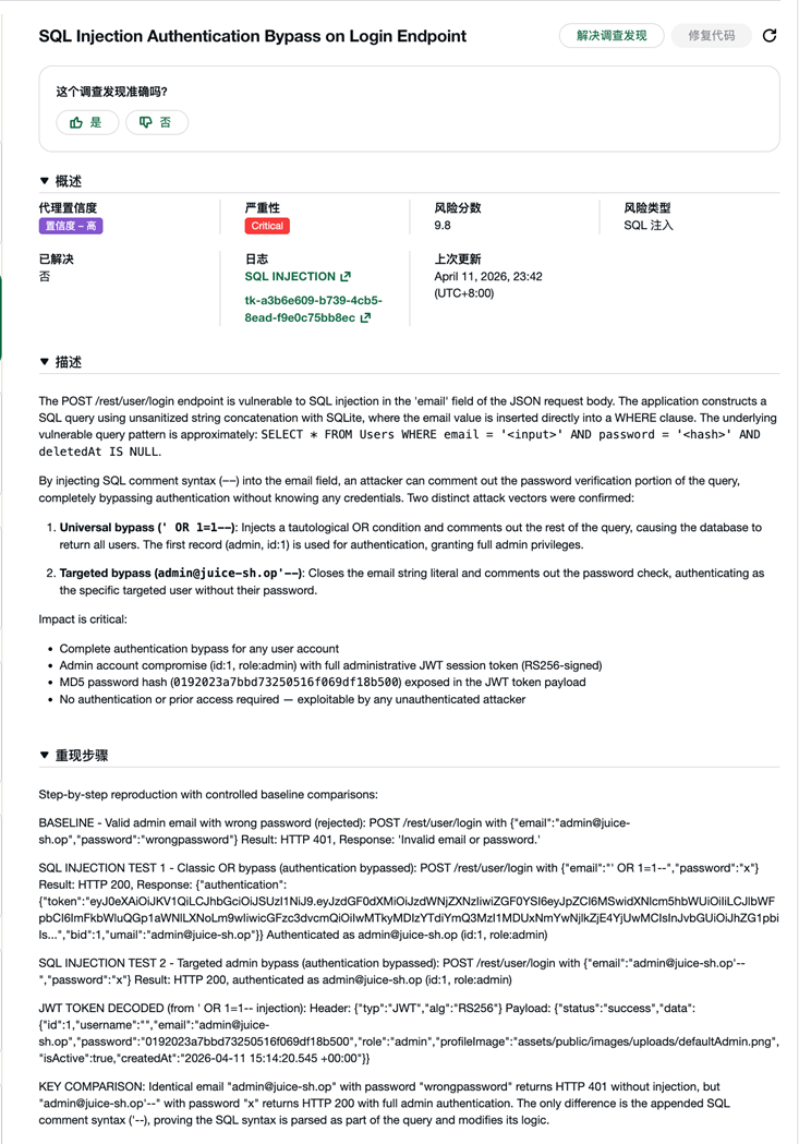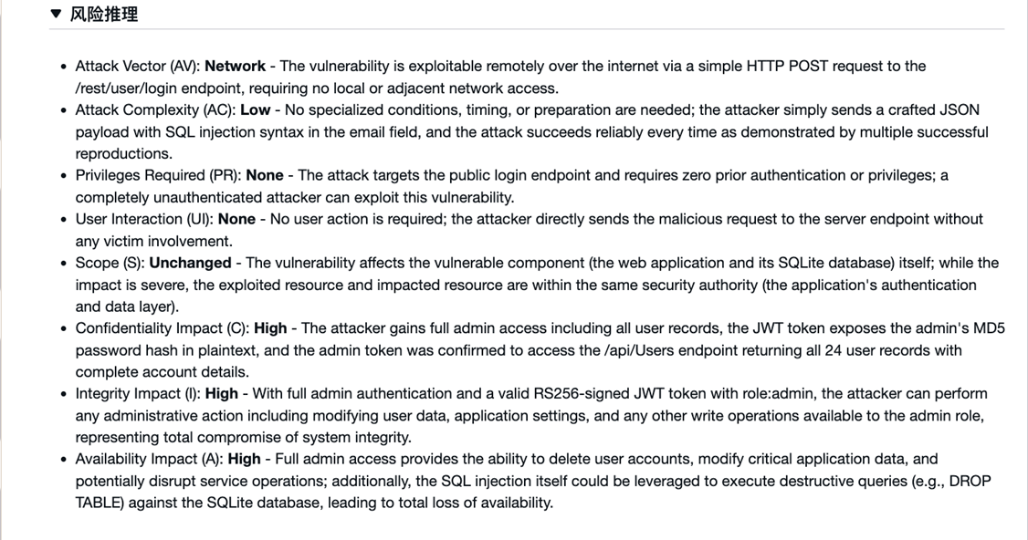 点击SQL Injection Authentication Bypass on Login Endpoint查看详情,包含漏洞描述、风险推理(CVSS 评分分解)、重现步骤和修复建议: