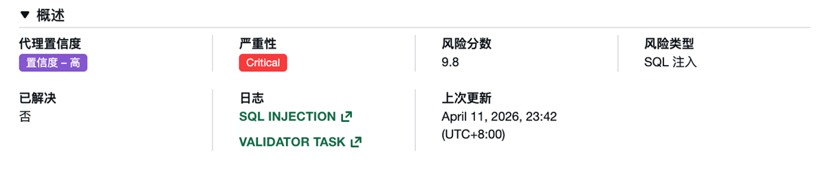字段 说明 置信度(Confidence) Agent 对该发现的置信度:High / Medium / Low。High 表示经过确定性验证器验证 严重程度(Severity) Critical(红)/ High(红)/ Medium(橙)/ Low(黄)/ Informational(蓝) 风险类型(Risk type) 漏洞类别,如 SQL Injection、XSS、IDOR 等 重现步骤 复现漏洞的技术步骤,包括 HTTP 请求/响应示例