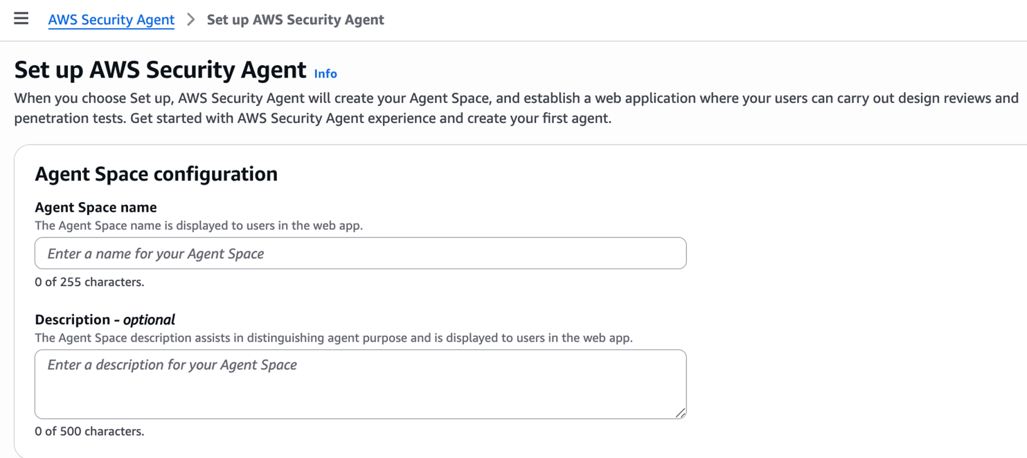 AWS Security Agent 的所有操作都在 Agent Space 中进行。Agent Space 是一个工作空间,代表一个需要保护的应用或项目。