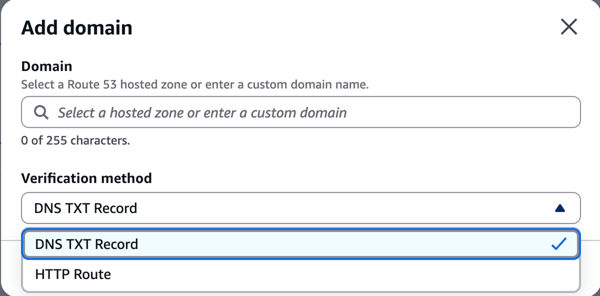 验证方式 操作 适用场景 DNS TXT Record 在 DNS 中添加一条 TXT 记录 任意 DNS 提供商 HTTP Route 在 Web 服务器上放置验证文件 有服务器文件管理权限 Amazon Route 53 一键验证 自动创建 DNS 记录 域名在同账号 Route 53 管理