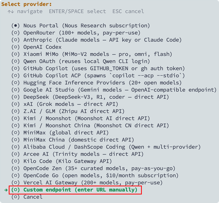 由于 Hermes Agent v0.8.0 尚未原生支持 Bedrock,在模型配置环节选择 Custom Endpoint,填入 LiteLLM 的地址: