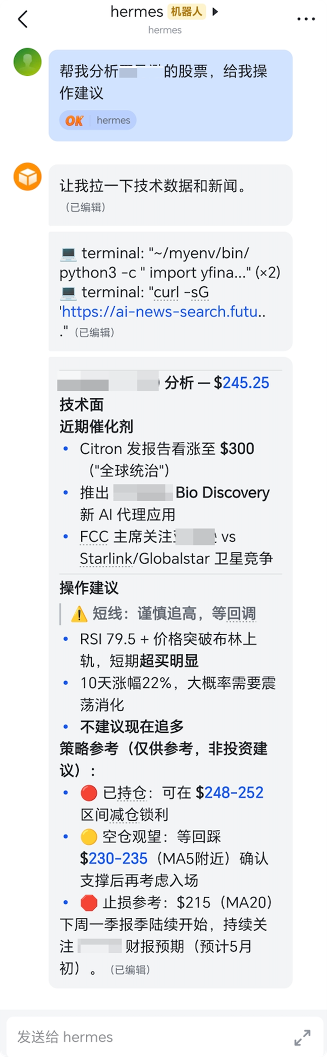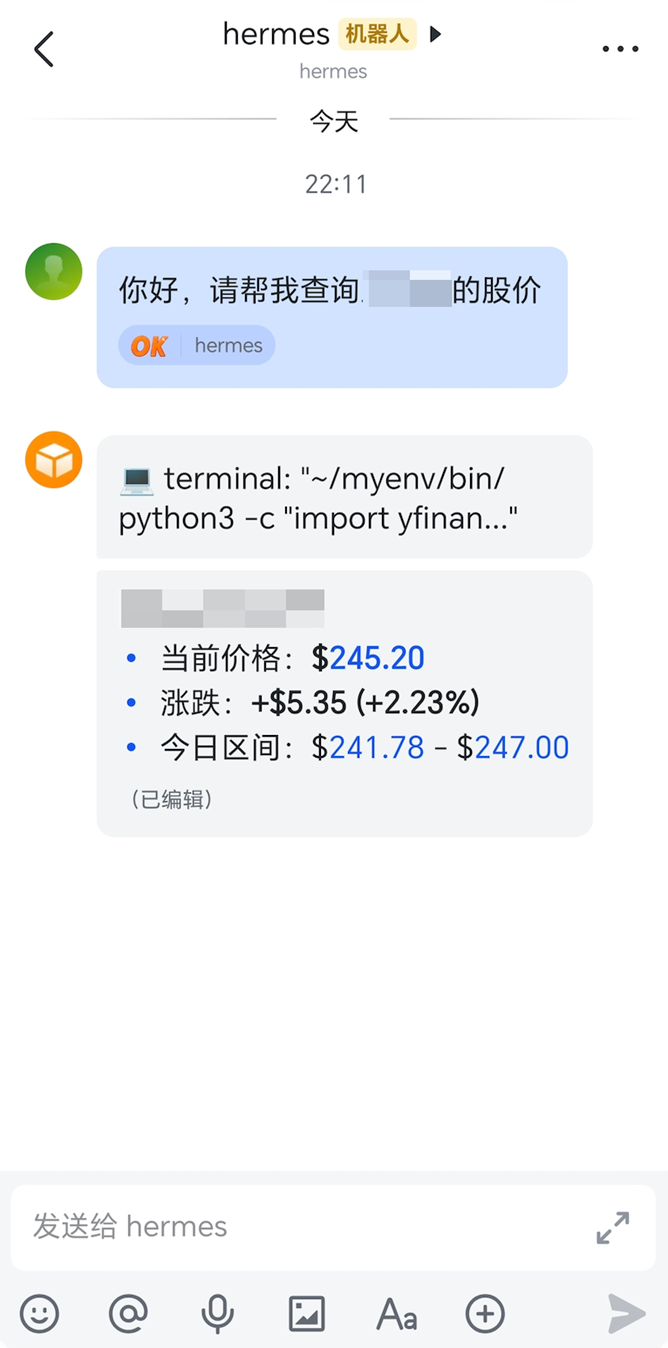 自建 Skill 负责拉行情数据,第三方 Skill 负责补资讯,Agent 把两边结果综合起来给出分析——不需要用户手动调度,Skill 之间的编排由 Agent 根据上下文自动判断。