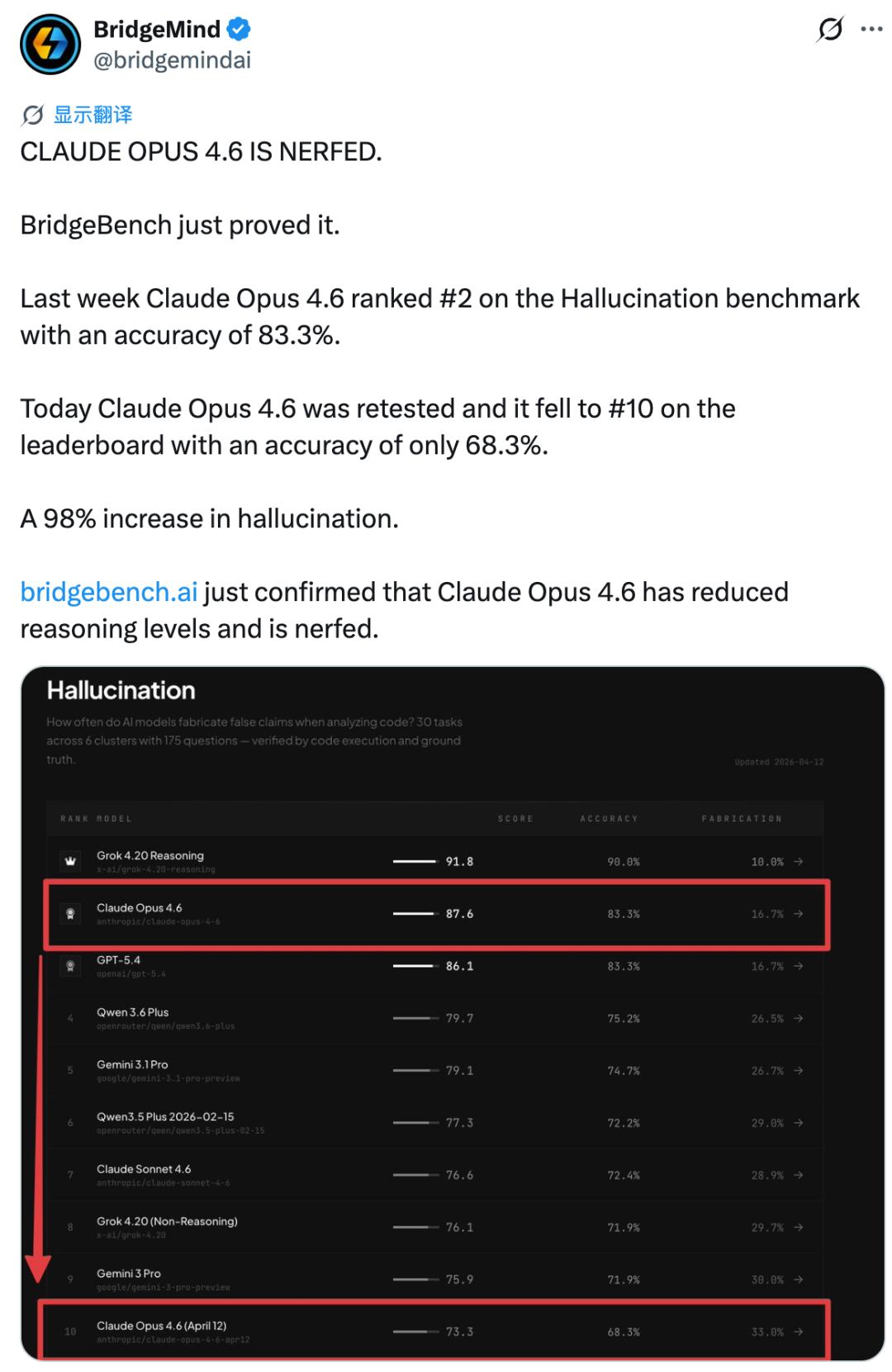 这种退步在第三方基准测试BridgeBench中表现得更加直观,Opus 4.6的准确率在短时间内从83.3%跌到了68.3%。