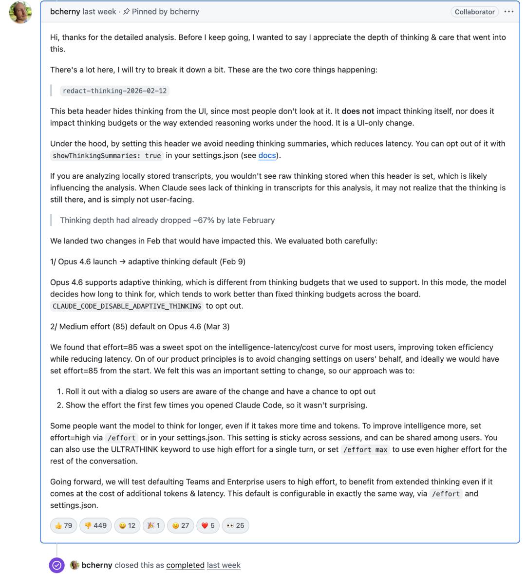 对于这些质疑,官方负责人Boris Cherny承认,目前模型默认开启的是努力程度为85分的“中等努力”模式。