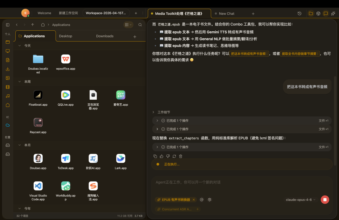 比如写融资 BP 时,你只需要在左侧打开产品设计文档、市场调研材料,对着 AI 说一句「写一版种子轮融资 BP」,它就能自动读取所有上下文,生成完整的 BP 内容,甚至能根据需求迭代 20 多个版本,全程没有任何文件传输的操作;招聘写 JD 时,你不用再大段给 AI 解释公司情况,只需要说一句「帮我写一个测试岗位的招聘 JD」,AI 就能自动读取左侧的公司资料,生成精准匹配需求的文案,你只需要微调细节就能使用;内容创作时,你可以直接用内置浏览器浏览博主的社交媒体内容,一句话让 AI 把博主三天的帖子整理、转录、配音,生成一期完整的播客,全程不用切换窗口、不用下载转录工具。