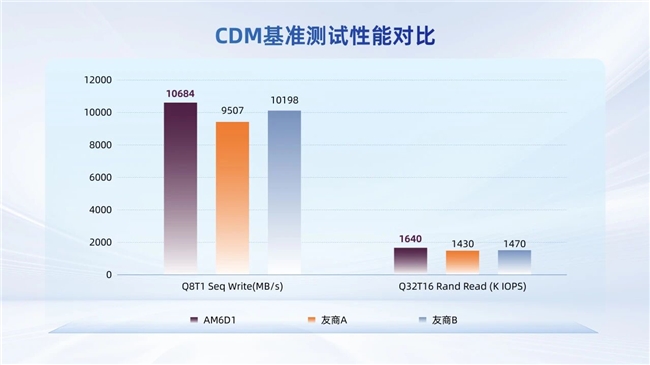 在CDM基准测试中,AM6D1实现了顺序读写10.7⁄10.6GB/s(1TB)、随机读写1500/1150K IOPS(1TB)的标称性能,并在关键指标上明显优于友商。其中,Q8T1顺序写性能达10684MB/s,友商A与友商B同类PCIe 5.0产品分别为9507MB/s和10198MB/s;Q32T16随机读性能达1640K IOPS,显著超越友商A的1430K IOPS及友商B的1470K IOPS。