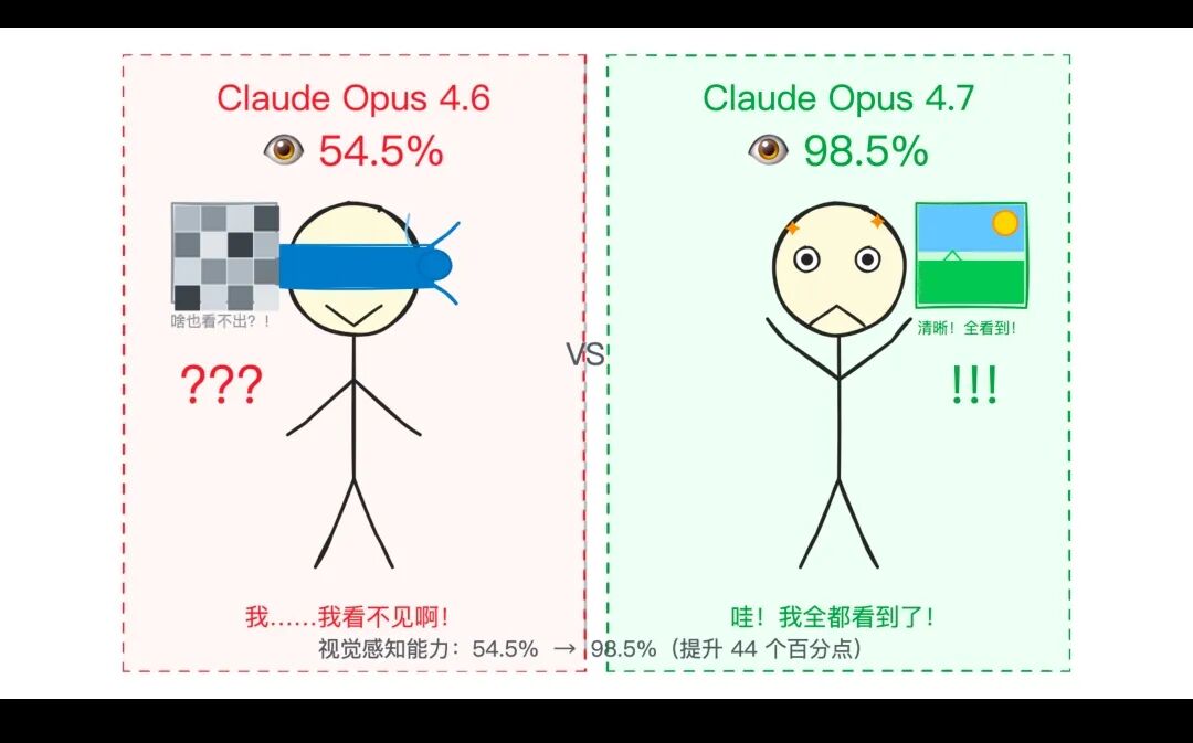 本次升级最亮眼的是视觉能力。高清图像支持2576像素输入,分辨率达到前代3倍,视觉感知评分从54.5%飙升至98.5%。