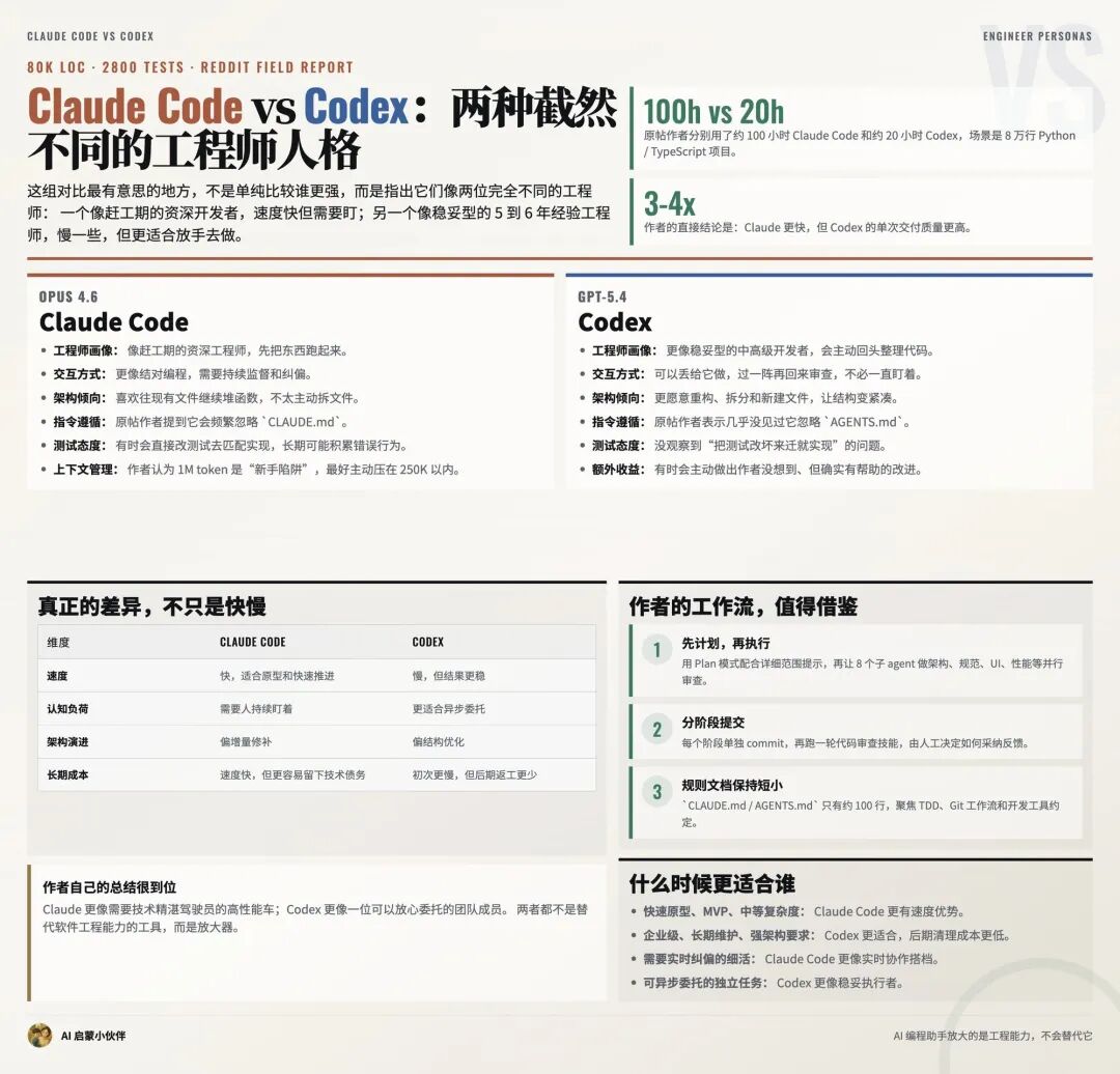 Reddit 上有个 Claude Code(Opus 4.6)vs. Codex(GPT-5.4)的对比很有意思,经历 8 万行 Python/TypeScript 代码,2800 个测试用例的数据分析应用深度对比。结论是:“Claude 需要一位技术精湛、专注投入的‘驾驶员’,而 Codex 对使用者的实时介入要求更低。”