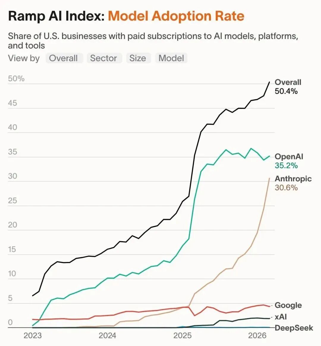 “现在每四家 Ramp 上的企业就有一家在付费用 Anthropic,一年前这个比例是二十五分之一。”Ramp 经济学家 Ara Kharazian 这样说。