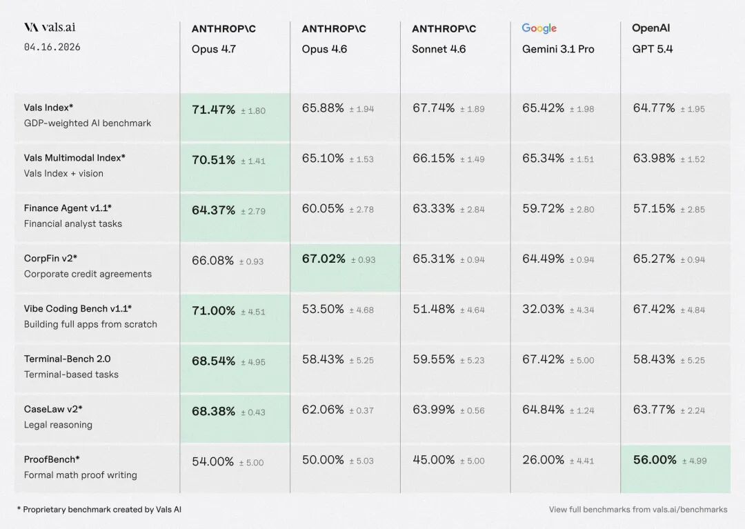 在 Vals Index 综合评测中,Opus 4.7 以 71.4% 的得分拿下第一,比之前的最好成绩(67.7%)大幅跃升。它还在 Vibe Code Bench、Vals Multimodal、Finance Agent、Mortgage Tax、SAGE、SWE-Bench 和 Terminal Bench 2 等多个榜单中均位列第一。