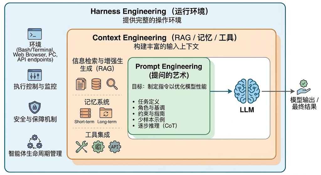 Prompt Engineering 解决的是如何把任务说明白,Context Engineering 解决的是如何把关键信息摆到模型眼前,Harness Engineering 解决的是如何让模型在真实环境里稳定做事。