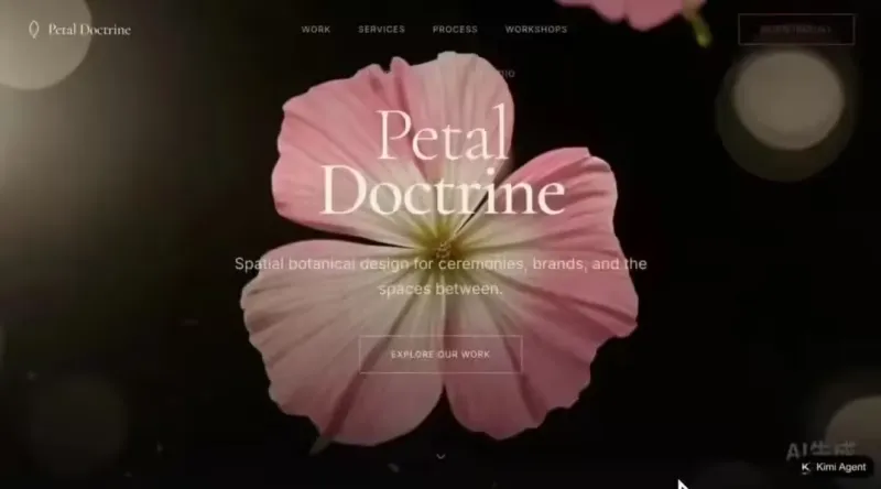 在代码驱动设计方面,K2.6 的 Agent 模式能够制作具有设计感和视觉冲击力的网站。凭借对图像和视频生成工具的熟练调用,该 Agent 可以生成视觉风格高度统一的素材,构建视觉焦点突出的首屏区,并实现交互元素和滚动触发动效。