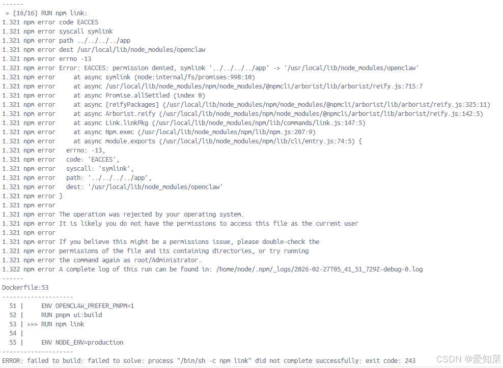 2. 修改Openclaw的Dockerfile,在“RUN npm link”前,加入USER root。使用root身份执行“RUN npm link”,执行后再切回node用户。