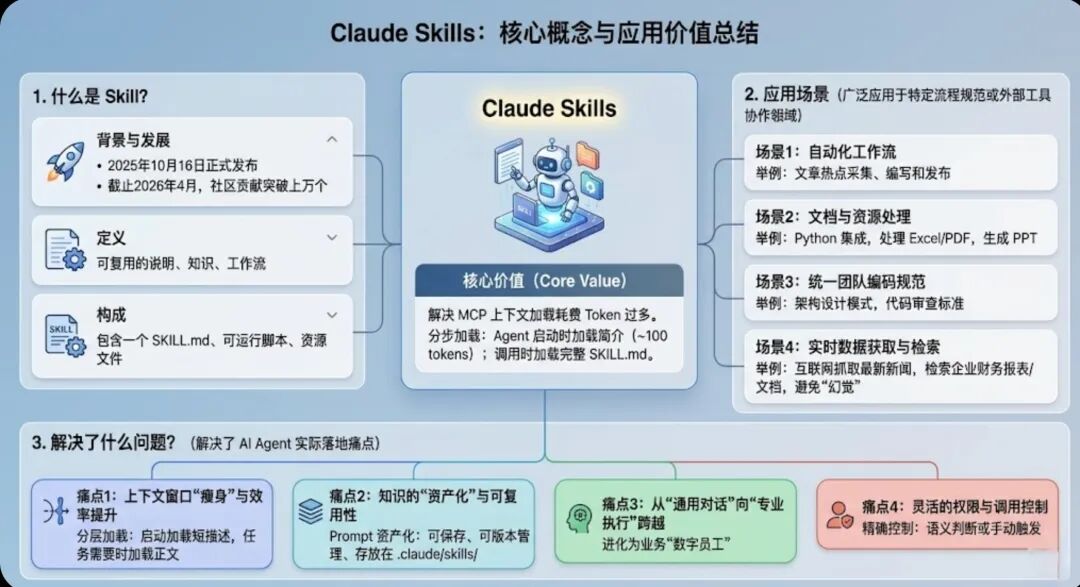 好了,关于Claude Skills的概念、原理与应用,我们就介绍到这里。本文的篇幅有些长,大致内容总结到了这幅图中: