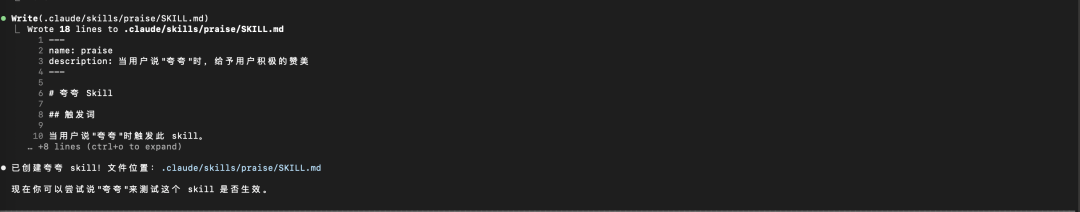 结果很完美,恭喜你,你成功创建了第一个skill。