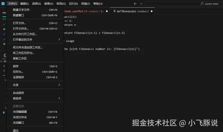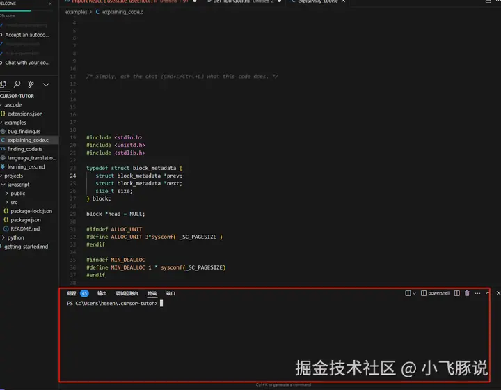 3.代码编辑区: 这是你主要的工作区域,位于界面的中央。这里你可以编写、编辑和查看代码。Cursor AI的代码编辑区支持语法高亮、代码折叠、自动补全等功能。