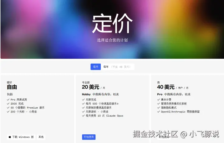 点击后,就可以打开我们的cursor页面了。开启我们的AI辅助编程之旅 2、cursor注册 cursor不是免费完全免费的软件,Pro用户需要20刀一个月,和ChatGPT plus一样。