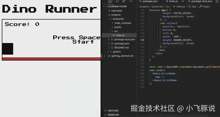 Cursor AI不仅支持代码编写,还集成了运行和测试功能,帮助你在同一环境中完成从编写到调试的全过程。 使用方法: 安装依赖:在终端中输入npm install,安装项目所需的依赖包。Cursor AI会自动检测项目的依赖,并在终端中显示安装进度。 运行应用:依赖安装完成后,输入npm start启动你的应用。Cursor AI会自动打开本地服务器,通常在localhost:3000端口运行。 查看结果:打开浏览器,访问localhost:3000查看应用的运行效果。你可以在Cursor AI中同时查看代码、运行应用并进行调试。 调试和优化:如果在运行过程中发现问题,你可以随时回到代码编辑区进行修改,并立即重新运行代码,查看修改效果。 五、实战示例:创建一个简单的游戏 为了让你更好地理解和掌握Cursor AI的功能,让我们通过一个实战例子来创建一个简单的游戏。这个游戏类似于Chrome浏览器离线时的恐龙游戏。 操作步骤: 新建JavaScript文件:在Cursor AI中打开一个新项目,并创建一个名为game.js的JavaScript文件。