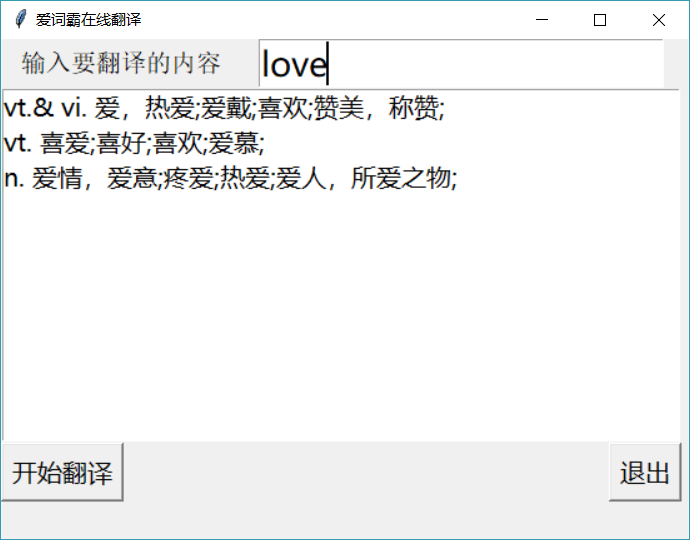import requests from tkinter import * def translate(): url="http://fy.iciba.com/ajax.php?a=fy" header={ "User-Agent": "Mozilla/5.0 (Windows NT 10.0; WOW64) AppleWebKit/537.36 (KHTML, like Gecko) Chrome/75.0.3770.142 Safari/537.36" } data={ "f":"auto", "t":"auto", "w":entry.get() } response=requests.get(url=url,params=data,headers=header) #print(response.json()) print(response.json()['content']['word_mean']) for i in response.json()['content']['word_mean']: text.insert(END,i) text.see(END) text.update() root = Tk() root.title("爱词霸在线翻译") root.geometry("550x400+550+230") label = Label(root, text="输入要翻译的内容", font=('宋体', 15)) label.grid() entry = Entry(root, font=('微软雅黑', 20)) entry.grid(row=0, column=1) text = Listbox(root, font=("微软雅黑", 15), width=45, height=10) text.grid(row=1, columnspan=2) button = Button(root, text="开始翻译", font=("微软雅黑", 15),command=translate) button.grid(row=2, column=0, sticky=W) button1 = Button(root, text="退出", font=("微软雅黑", 15), command=root.quit) button1.grid(row=2, column=1, sticky=E) mainloop()