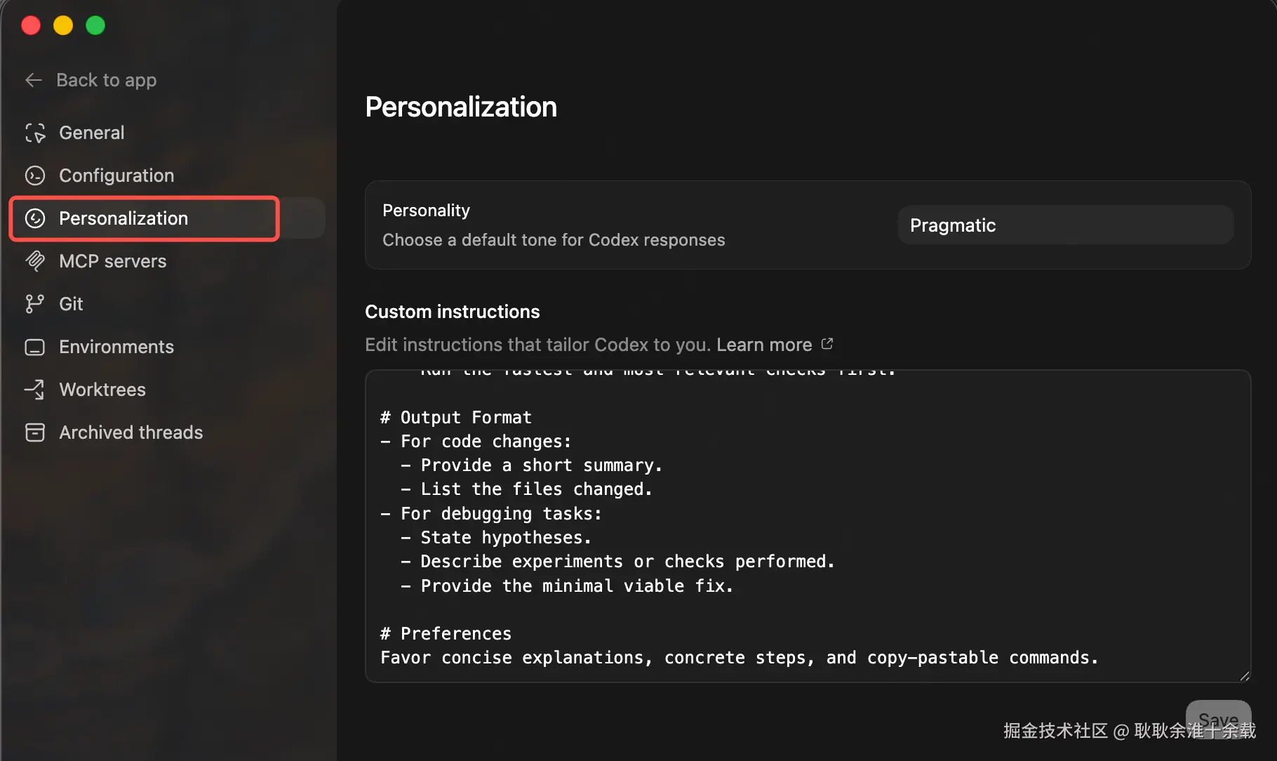 - 然后在Personalization(个性化设置)这一块,可以填一下全局规则,这个其实就是命令行见面中的AGENT.md,只不过OpenAI单独拎出来了。