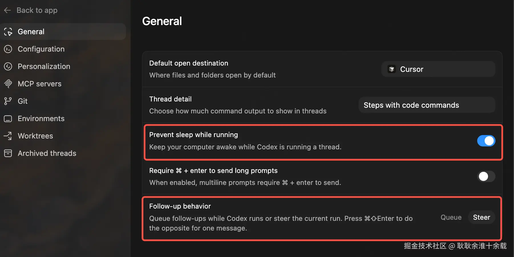 - 在General里,1️⃣把保持电脑开机的开关打开,2️⃣Follow-up behavior那个选项改成steer