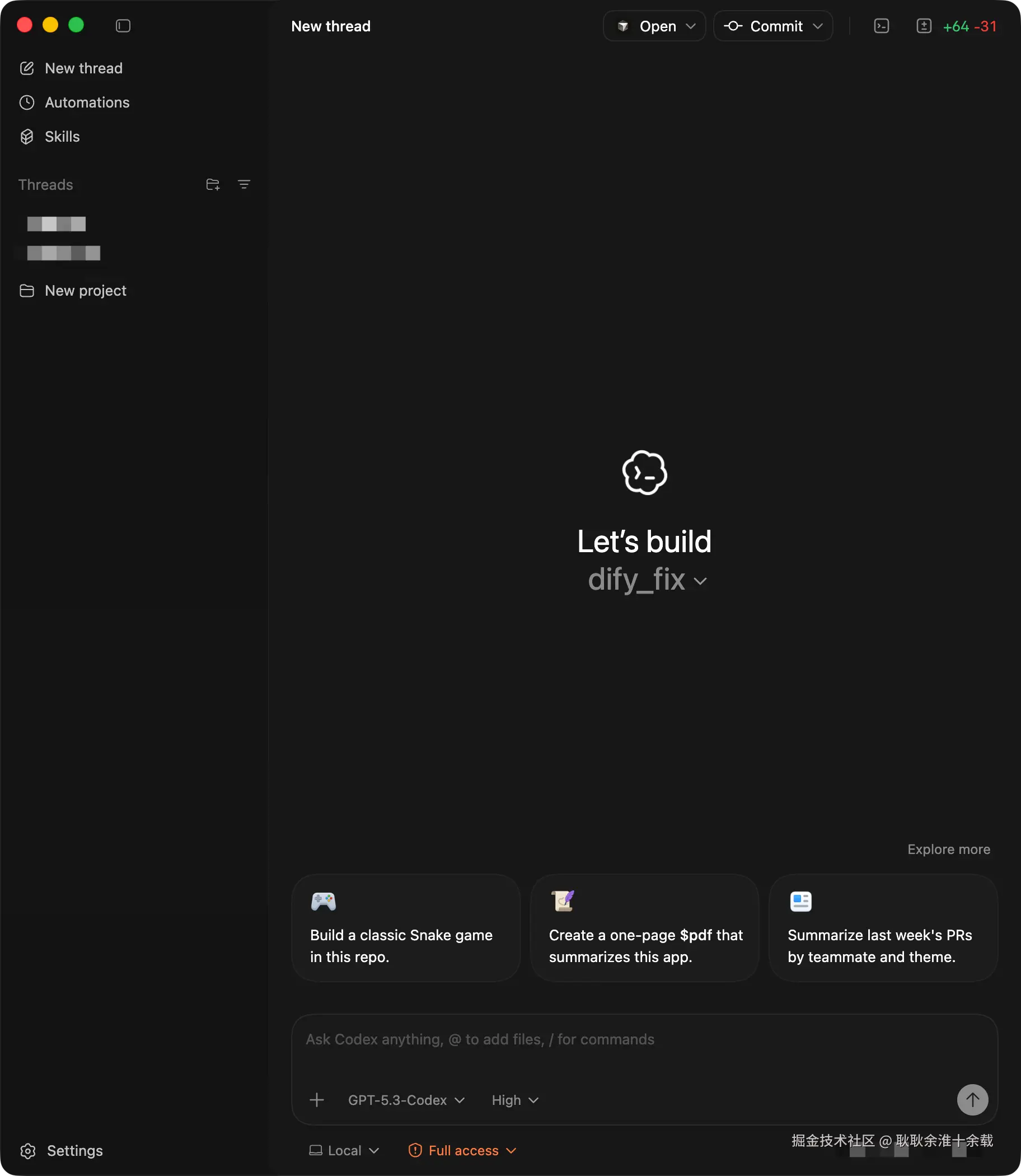 当前无法直接在 APP中或者cli中选到GPT-5.3-Codex模型,有钞能力的同学,可以直接修改~/.codex 中的 model ,重启 codex 就可以了选到GPT-5.3-Codex模型了。