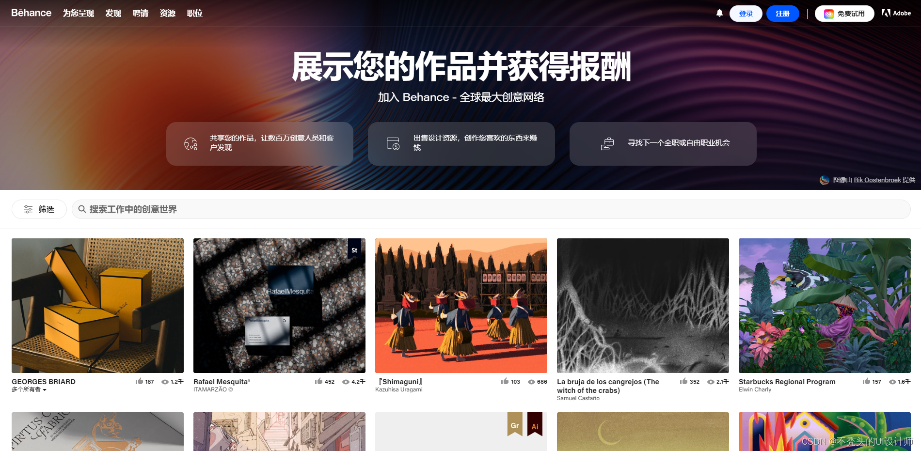 世界上最大的设计社区:Behance拥有1200多万注册用户,是世界上最大的设计社区之一。你可以在这里找到来自世界各地的顶尖设计师和他们的精彩作品,进行灵感交流和创作学习。