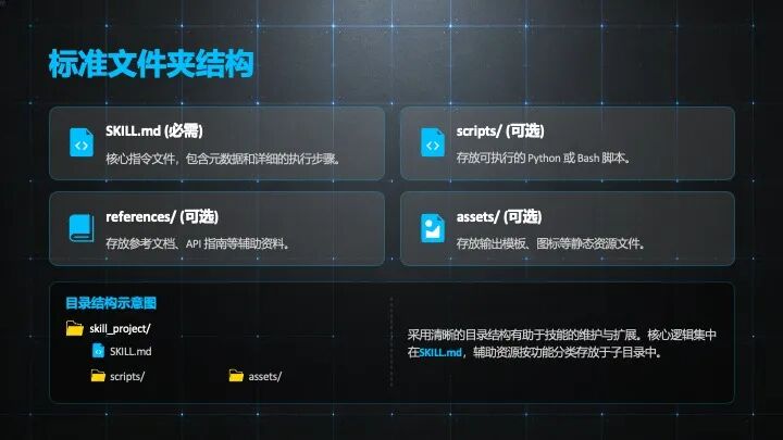 一个Skill的物理形态是一个文件夹。其中,SKILL.md是核心文件,它定义了技能的元数据和执行逻辑。此外,我们还可以根据需要添加scripts、references和assets等子文件夹,用于存放脚本、参考资料和资源文件,构建一个完整的技能生态。