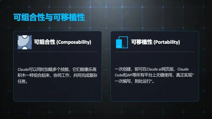 除了渐进式披露,Skills还具备可组合性和可移植性。你可以创建多个小而专的技能,让它们协同工作,解决复杂问题。同时,你在一个平台上创建的技能,可以无缝迁移到其他平台使用,无需任何修改,这大大提升了技能的复用价值和开发效率。