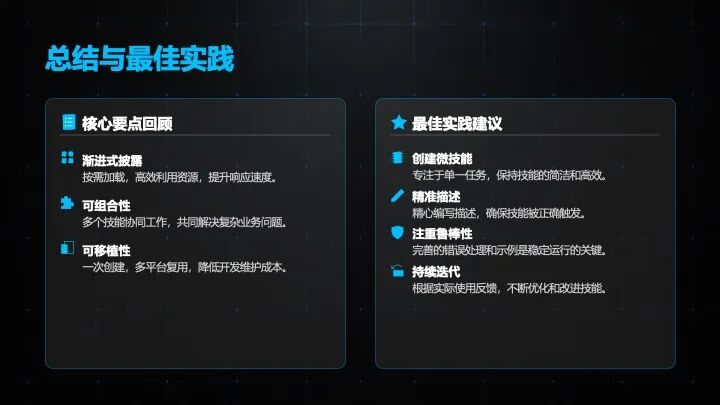 总结一下,ClaudeSkills的核心在于其渐进式披露、可组合性和可移植性三大设计原则。在实践中,建议大家创建小而专的微技能,写好精准的触发描述,注重技能的鲁棒性,并持续迭代优化。记住,一个好的技能是在不断使用和反馈中打磨出来的。