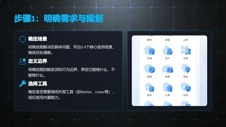 开发技能的第一步是明确需求。你需要想清楚,这个技能是用来解决什么问题的?用户会在什么场景下使用它?它的能力边界在哪里?是否需要调用外部工具?把这些问题想清楚,后续的开发工作才能有的放矢。