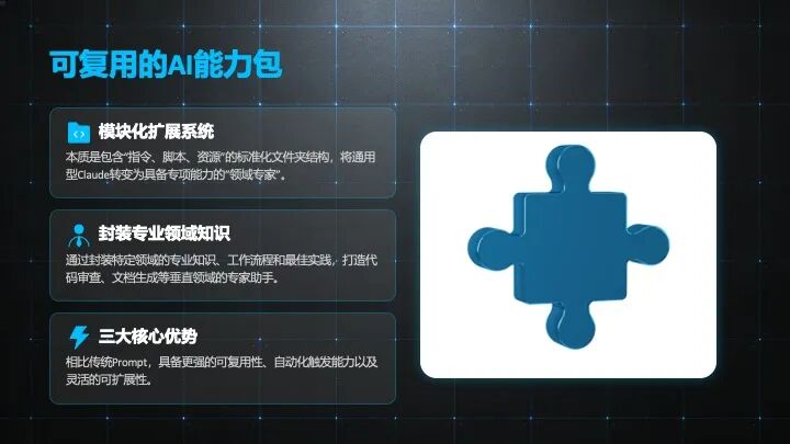 简单来说,ClaudeSkills就是一个可复用的AI能力包。它不是一次性的提示词,而是一个包含了指令、脚本和资源的标准化文件夹。通过它,我们可以将Claude打造成某个特定领域的专家,比如代码审查专家、文档生成专家等。它最大的优势在于可复用性,一次创建,多次调用,并且能够根据用户的输入自动触发,极大地提升了工作效率。