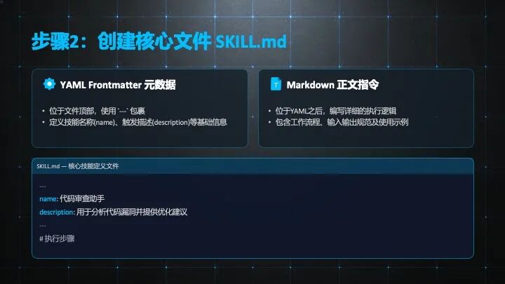 规划完成后,我们就可以开始创建核心文件SKILL.md了。这个文件分为两部分:头部的YAML配置和主体的Markdown指令。YAML配置告诉Claude这个技能的基本信息和触发条件,而Markdown正文则详细指导Claude如何执行具体任务。
