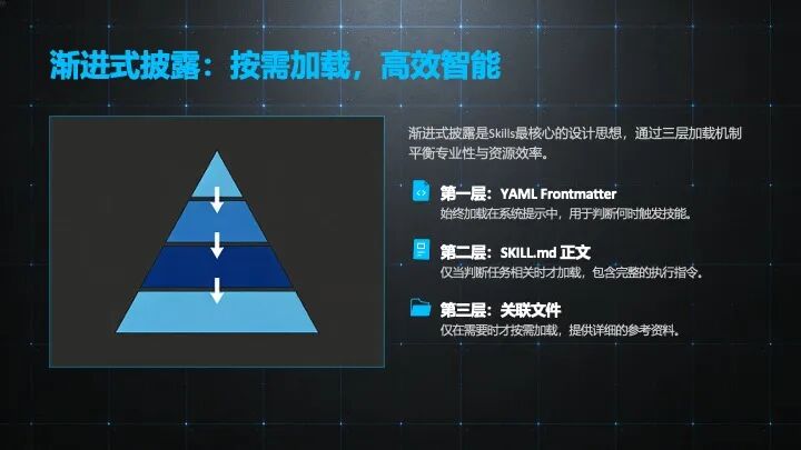 渐进式披露是Skills设计的精髓。它像一个聪明的助手,只在需要的时候才展示详细信息。首先,它会用一个简短的“名片”(YAML配置)来判断是否需要这项技能;如果需要,再加载完整的“操作手册”(SKILL.md正文);如果执行过程中需要查阅资料,才会去打开“图书馆”(关联文件)。这种按需加载的方式,极大地提高了效率,避免了资源浪费。