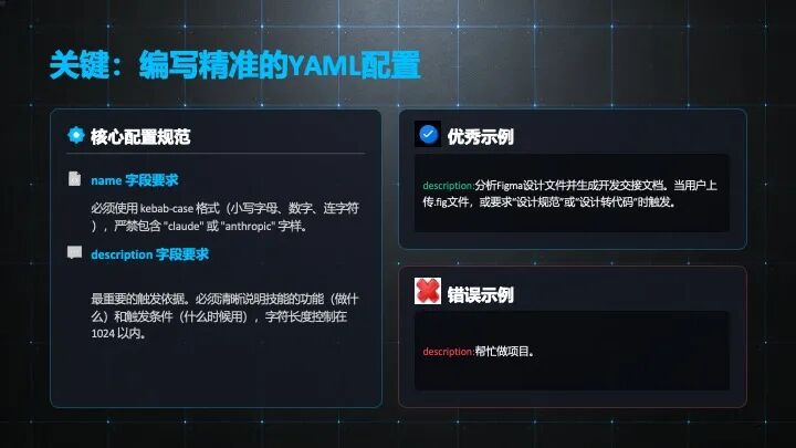 在YAML配置中,description字段是重中之重。它直接决定了Claude能否在正确的时机触发你的技能。一个好的描述应该清晰地说明“做什么”和“什么时候用”,比如“当用户上传PDF文件并要求提取文本时,使用此技能”。反之,模糊的描述如“帮忙处理文件”则无法让Claude准确判断。
