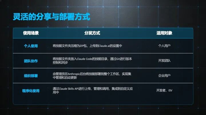 无论是个人使用、团队协作,还是企业部署,Claude都提供了相应的解决方案。个人用户可以直接上传ZIP包;团队可以通过Git共享技能;企业管理员可以在后台统一部署;开发者则可以通过API将技能集成到自己的应用中。这种灵活性使得Skills能够适应各种规模和场景的需求。