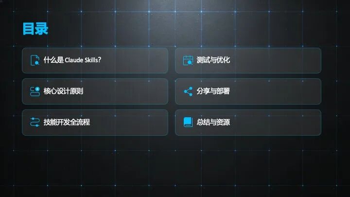 本文将分为六个部分。首先,我们会了解什么是ClaudeSkills及其核心价值。接着,深入探讨其背后的设计原则。然后,我们将详细拆解技能开发的完整流程,从需求规划到代码编写。之后,我们会学习如何对技能进行测试和优化,确保其稳定可靠。最后,我们会介绍技能的分享与部署方式,并进行总结,提供更多学习资源。