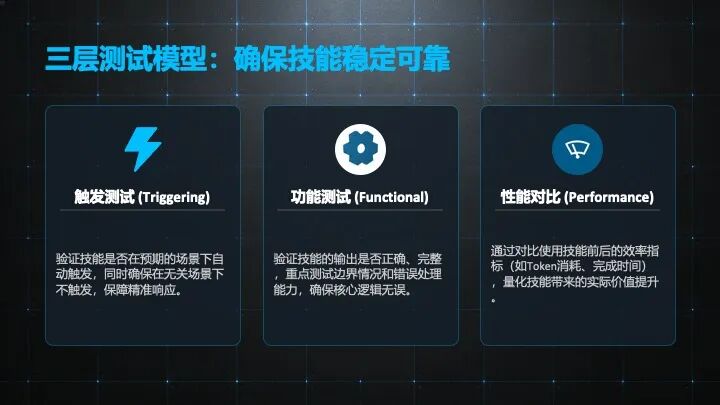 测试技能时,我们可以从三个层面入手。首先是触发测试,确保技能在该出现的时候出现,不该出现的时候不出现。其次是功能测试,确保技能的输出是正确的,并且能处理各种异常情况。最后是性能对比,通过数据来证明你的技能确实提升了效率,这对于团队或企业推广至关重要。