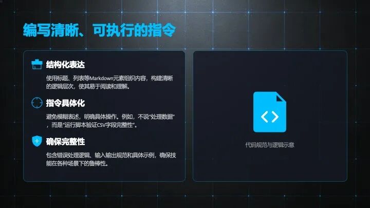 编写指令时,要把Claude当成一个需要详细指导的新手。你的指令必须清晰、具体、可执行。使用Markdown的结构来组织内容,让逻辑一目了然。同时,不要忘记处理可能出现的错误,并提供示例,这样才能确保你的技能在各种情况下都能稳定运行。