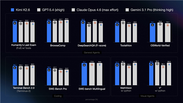 在多项权威基准测试中,Kimi K2.6表现亮眼。