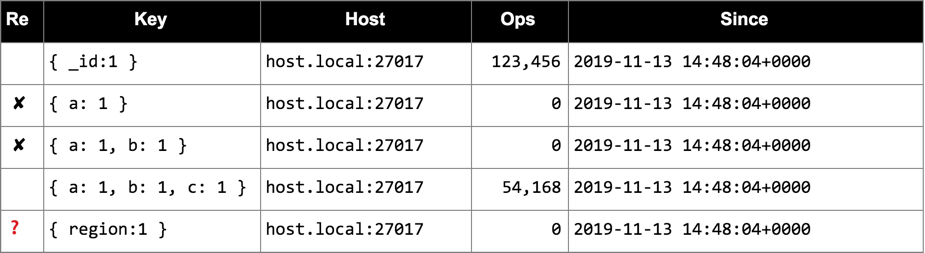 keyhole --index "mongodb:///test?replicaSet=rs" test.numbers: { _id: 1 } host: host.local:27017, ops: 123,456, since: 2019-11-13 14:48:04.473 +0000 UTC x { a: 1 } host: host.local:27017, ops: 0, since: 2019-11-13 14:48:04.473 +0000 UTC x { a: 1, b: 1 } host: host.local:27017, ops: 0, since: 2019-11-13 14:48:04.473 +0000 UTC { a: 1, b: 1, c: 1 } host: host.local:27017, ops: 54,168, since: 2019-11-13 14:48:04.473 +0000 UTC ? { region: 1 } host: host.local:27017, ops: 0, since: 2019-11-13 14:48:04.473 +0000 UTC